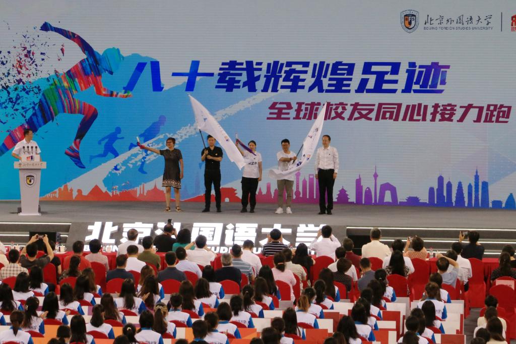捐赠仪式后,党委副书记、副校长贾文键及众多知名校友共同启动“八十载辉煌足迹,全球校友同心接力跑”活动。我院卓悦同学作为留学生代表参与传递接力棒、接力旗环节。