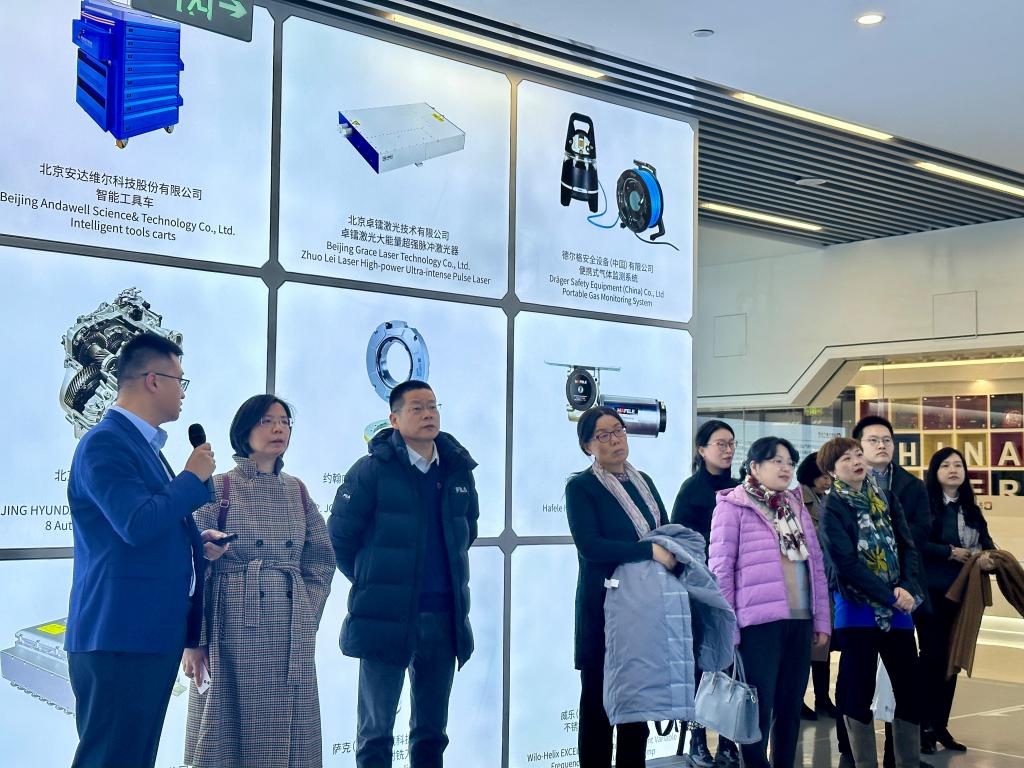 在北京中德产业园运营公司副总经理孙海龙的引导下,必赢76net线路官网教师党支部一行详细了解了产业园在搭建国家级对德合作平台、服务国家级对德合作项目、链接全国对德合作资源等方面的建设成果。北京中德产业园是国家发改委批复的国内首个以“经济技术合作”为主题的中德示范区。园区定位为“德国先进制造业的聚集地、中德隐形冠军发展的战略高地、中德交往与开放创新的重要窗口”,聚焦新能源智能汽车、智能装备、数字经济三大主导产业,和先进制造服务业支撑产业,已集聚奔驰、宝马、Ameco、博世、威乐水泵等90余家德资企业,年产值350亿元。