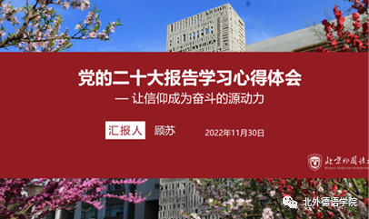 会议的第三部分,支部入党积极分子、必赢76net线路官网青年教师代表顾苏分享了学习二十大报告的心得。她认为,二十大报告系统回顾总结了新时代十年的伟大变革,科学擘画了未来中国发展的宏伟蓝图,其中突出强调了教育、科技和人才的作用。作为具有鲜明“红色基因”的北外教师,我们应不忘初心、牢记使命,为党育人,为国育才,切实将二十大精神有机融入到教学工作中;发挥自身的学科优势,为构建中国特色的学科、学术体系以及话语体系添砖加瓦,把服务国家作为科研工作的最高追求。她结合个人参与庆祝中德建交50周年《中德大咖谈》节目录制的经历,认为外语教师应力求在大格局下讲好小故事,向世界发出中国声音。