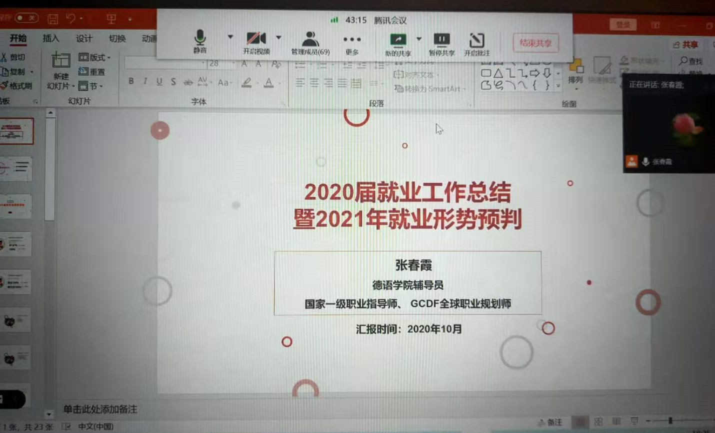 10月16日17:00—19:00,必赢76net线路官网召开“2020年就业总结及2021年就业形势研判”线上会议。70余名研究生参加了会议。辅导员张春霞总结了必赢76net线路官网近五年来研究生就业情况,分析了研究生的就业类型、就业行业、就业数据等,结合2021年高校毕业生人数、全国德语专业毕业生人数、目前秋招情况等对2021年的德语专业就业形势进行了分析和预判,对2021年的研究生就业进行了布置。