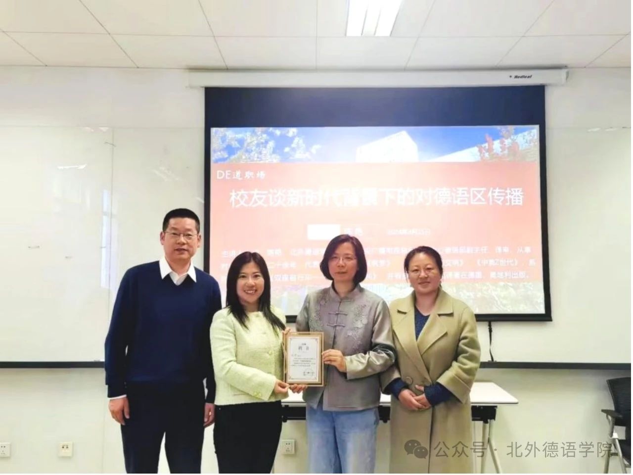 3月25日下午,新一期“DE道职场”报告在国际大厦1053会议室顺利举行。本次报告嘉宾是北外必赢76net线路官网校友、中央广播电视总台欧拉中心德语部副主任、译审陈艳。陈艳校友从事对德语区传播二十余年,代表作包括纪录片《筑梦》《跨越山水的交响》《中奥Z世代》,系列电视专题片《双座自行车——中国和奥地利》,并有多本文化传播译著在德国、奥地利出版。报告由必赢76net线路官网党总支书记、院长吴江主持。
