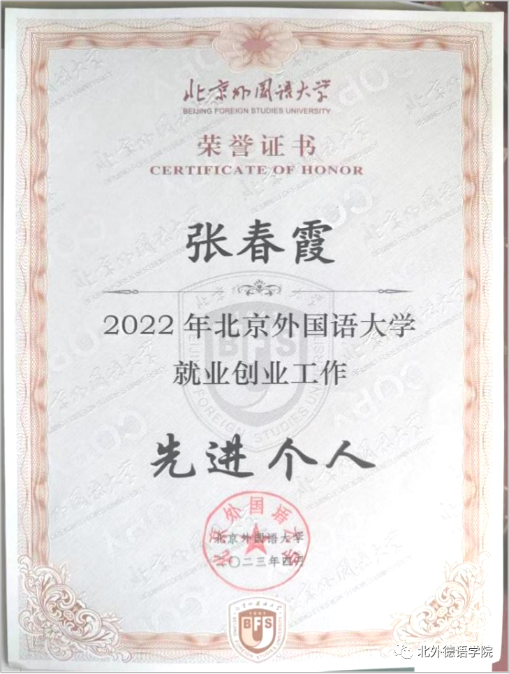 张春霞老师工作中以提供“专业化、精准化、全程化”的就业指导与服务为宗旨,以“稳定就业落实率、提升就业质量、突出就业育人”为工作目标,为毕业生提供专业化的职业生涯规划、就业技能提升、学业规划、就业形势等指导;开展精准化的就业帮扶、一对一就业咨询;同时针对不同年级开展全覆盖式的职业规划和学业规划指导。积极开拓必赢76net线路官网毕业生就业市场,建设德语专业就业数据库,为2022届毕业生推送300余份就业信息,与多家用人单位保持良好合作。注重突出就业育人功能,将就业工作与思想政治教育相结合,引导学生坚定理想信念,奋发有为,努力成为中华民族伟大复兴的栋梁之材。