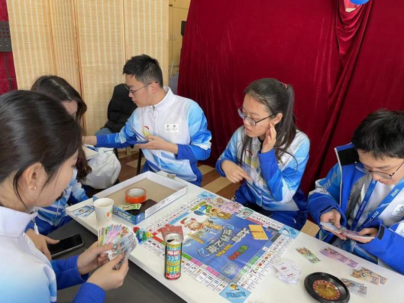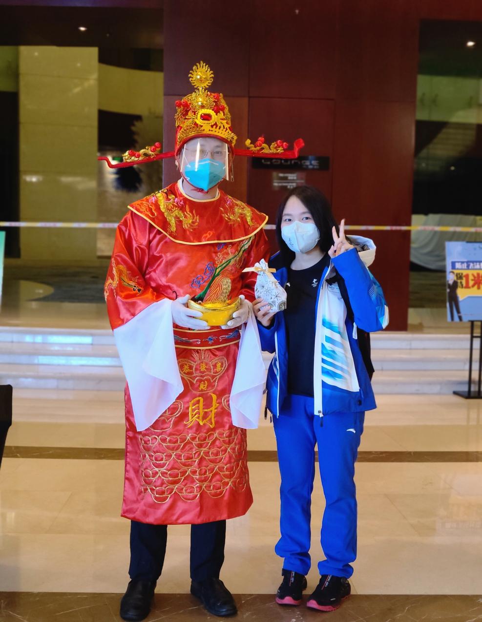 奥林匹克大家庭酒店的志愿者们在驻地开展了新春游园会,组织抽奖、拜财神等活动。