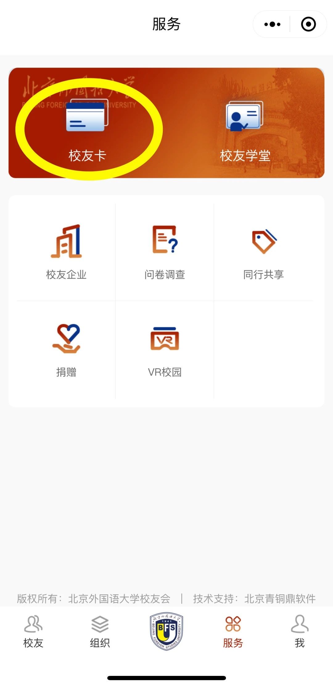 3. 点击"校友卡”并申请校友卡,根据提示填写信息后提交申请;
