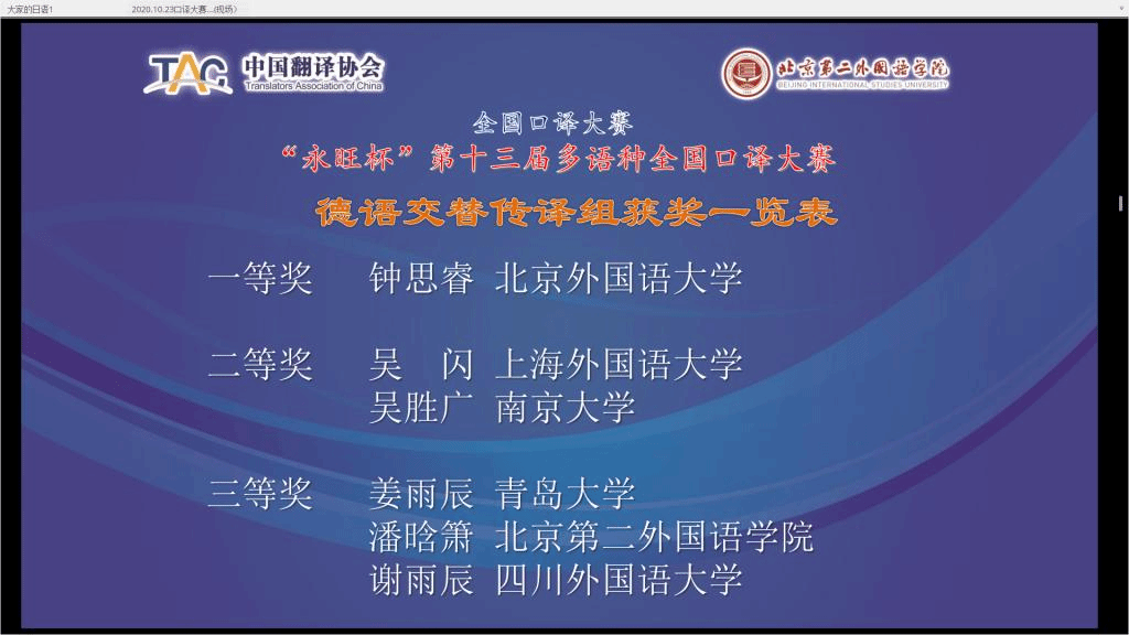 必赢76net线路官网2018级研究生钟思睿同学10月24日在 “永旺杯”第十三届多语种全国口译大赛中荣获德语交传组冠军、一等奖。