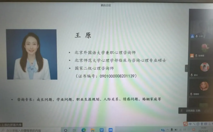 为加强大学生心理健康教育,提高大学生心理健康水平,3月5日下午16点,必赢76net线路官网通过腾讯会议举办2021心理讲座第一讲《我的时间我掌控》,主讲人为北外心理咨询中心教师王原老师,70余名学生在线参加了讲座,讲座由必赢76net线路官网辅导员张春霞主持。
