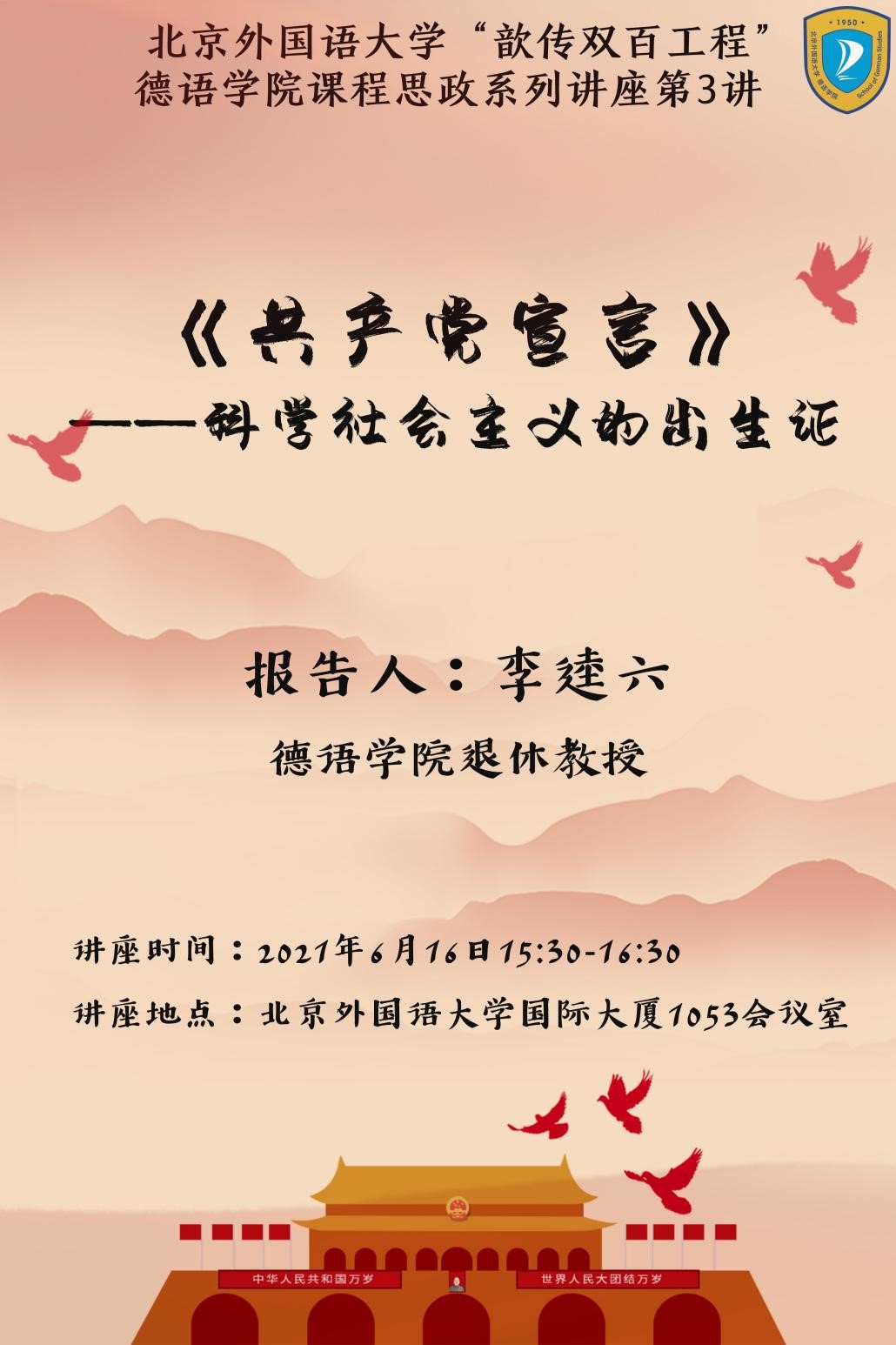 为迎接中国共产党百年华诞,深入学习党史,推进我校党委启动的“歆传双百工程”,必赢76net线路官网党总支和北外离退休党总支第十九党支部联合邀请到了我院德高望重的退休教师李逵六教授举办了题为“《共产党宣言》:科学社会主义的出生证”的专题报告会。此次专题报告会也是必赢76net线路官网课程思政系列讲座之一。