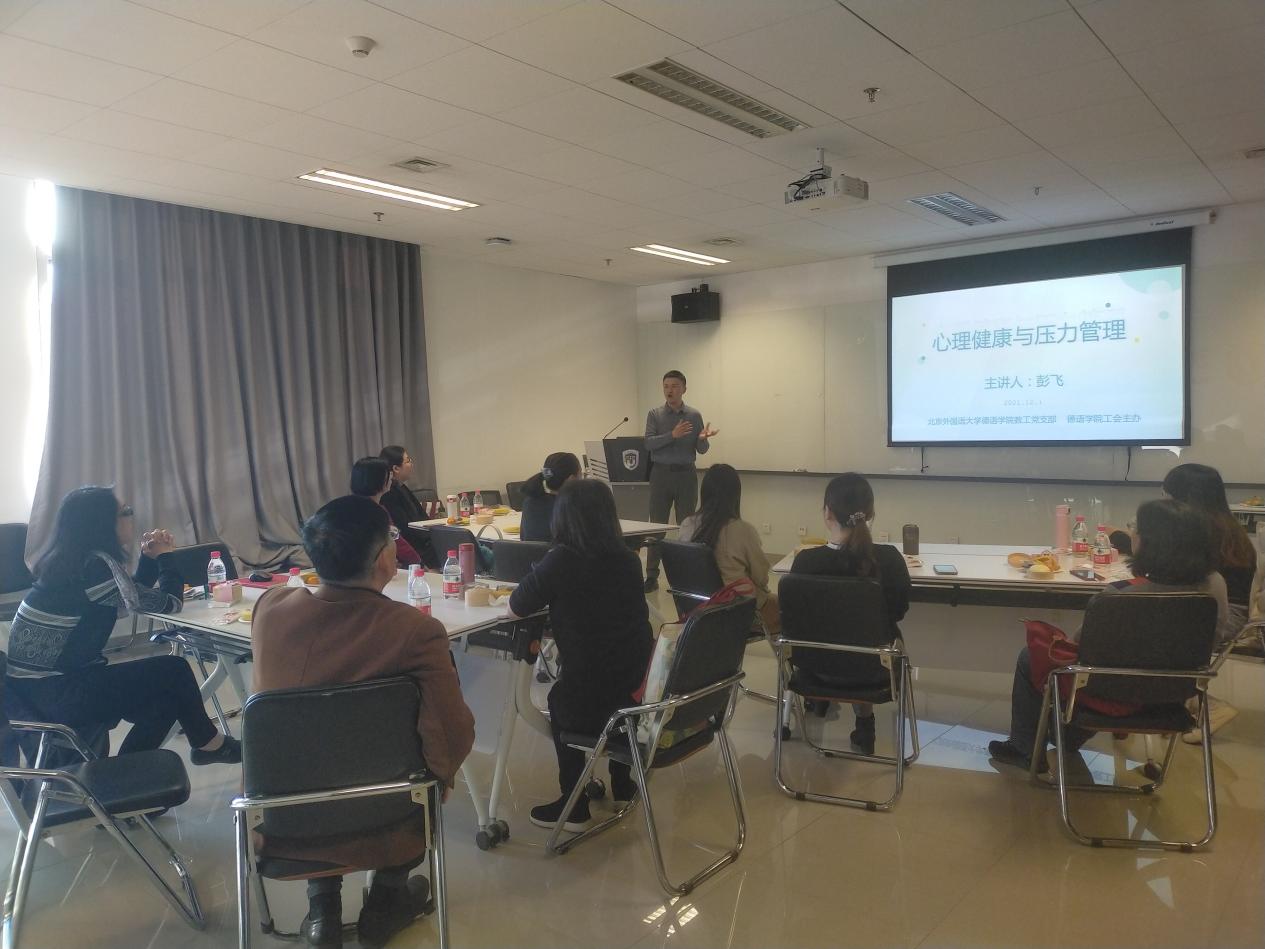 为增强教师对心理知识的了解,提升教师的心理健康水平,必赢76net线路官网教师党支部、必赢76net线路官网工会于12月1日13点至15点,在国际大厦1053会议室,联合举办教师“心理健康与压力管理”团体活动。北外心理咨询中心咨询师、国家二级心理咨询师彭飞为老师们讲授维护心理健康和缓解压力的知识。