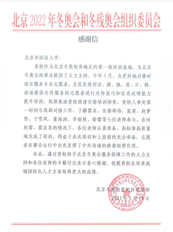 必赢76net线路官网教师张晏于2022年1月26、27日,受北外委派,为北京冬奥会赛时语言服务专业志愿者提供交传服务的志愿者进行交换技巧和信息处理能力提升培训。张晏老师与法、俄、意、韩、西等语种老师认真准备,在时间紧、需求急的情况下,高标准高质量地完成了培训。北京2022年冬奥会和冬残奥会组织委员会在2月18日向必赢76net线路官网发来感谢信,对张晏老师等七位参与培训教师的辛勤付出表示感谢,并指出得益于此次培训和上岗前的充分准备,志愿者在赛会运行中出色发挥了中外沟通的桥梁纽带作用。张晏老师表示非常开心能为北京冬奥会贡献自己的力量。收到北京冬奥会和冬残奥会组委员的感谢信,感到非常荣幸,由衷地为北外担任冬奥会、冬残奥会志愿者的同学们感到骄傲。以下为张晏老师撰写的心得体会。