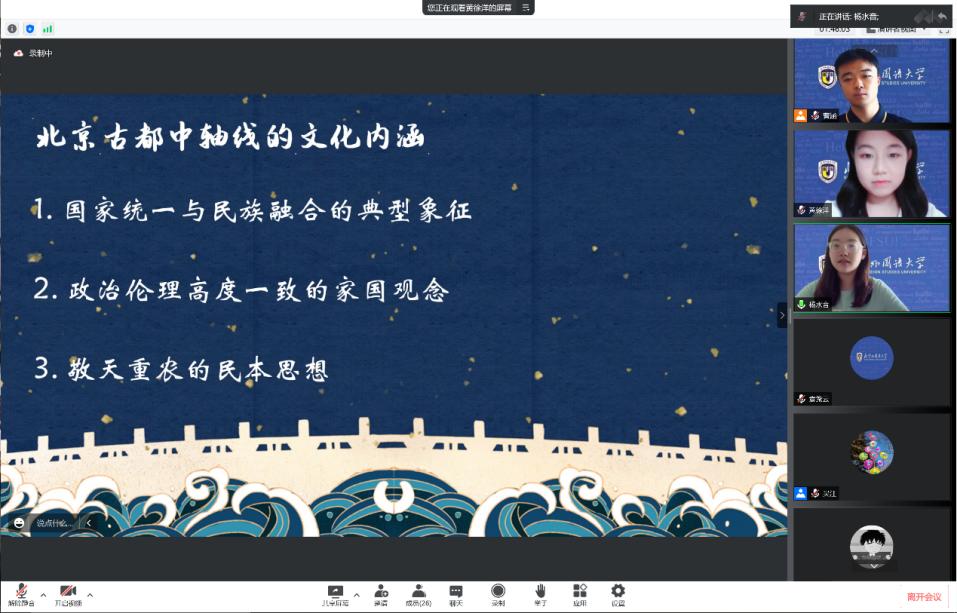报告会后的交流环节,北外“中轴线”系列项目发起人、必赢76net线路官网19级本科生曹涵首先发言。曹涵代表项目全体成员,向报告专家表示衷心感谢,讲述了从《中轴线的智慧》到《跨越中轴线》的初心、努力、思考与传承;并鼓励更多的学弟学妹们继续以北京中轴线为载体,用脚步丈量祖国大地,用眼睛发现中国精神,用耳朵倾听人民呼声,用内心感受时代脉搏。接下来,《跨越中轴线》大创项目负责人,必赢76net线路官网21级本科生黄徐洋介绍了项目团队的阶段性成果与研究开展思路:《跨越中轴线》项目以中德建交五十周年为背景,聚焦北京与柏林城市中轴线的变迁,结合中德文化外交、中德跨文化交际等学科方向,开展一系列课题研究与实地调研。黄徐洋向报告专家请教:北京中轴线应如何突破城市、地域的界限,最终走向中国,走向世界?随后,《跨越中轴线》北京市暑期社会实践项目负责人、必赢76net线路官网21级本科生杨水音介绍了项目团队梳理的北京中轴线文化内涵六大核心理念,并向报告专家虚心请教:如何将文化内涵、文化价值观更好地运用于讲好中国故事的实践?