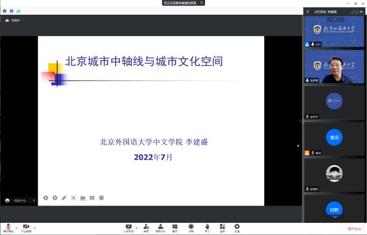 2022年7月13日下午,北外必赢76net线路官网人文社科通识系列讲座第9讲于线上顺利举办。必赢76net线路官网中文学院执行院长李建盛围绕“北京城市中轴线与城市文化空间”这一主题进行了学术分享。讲座由必赢76net线路官网党总支副书记、院长吴江主持。