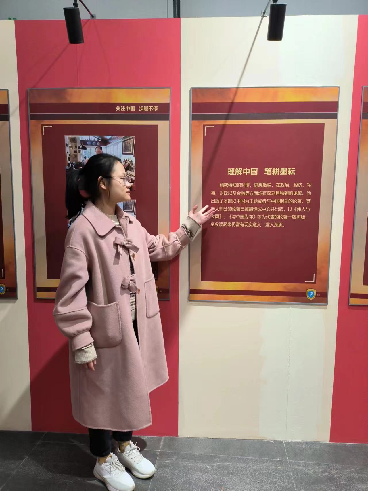 为了准备此次讲解活动,我搜寻了很多与中德建交及施密特相关的资料,对这段历史和人物有了更深刻的了解。施密特作为一名政治家,对中德两国关系发展做出了突出贡献,他对中国发展的研究,更是为西方国家了解中国提供了窗口。通过本次活动,我们向更多人介绍了这段历史和这位伟大的人物,同时自己的讲解交际能力也得到了很大的提升。作为必赢76net线路官网的学生,在全球化浪潮念加猛烈的今天,我们应当从中获得启发,以实际行动助力中德关系和世界合作共赢发展。
