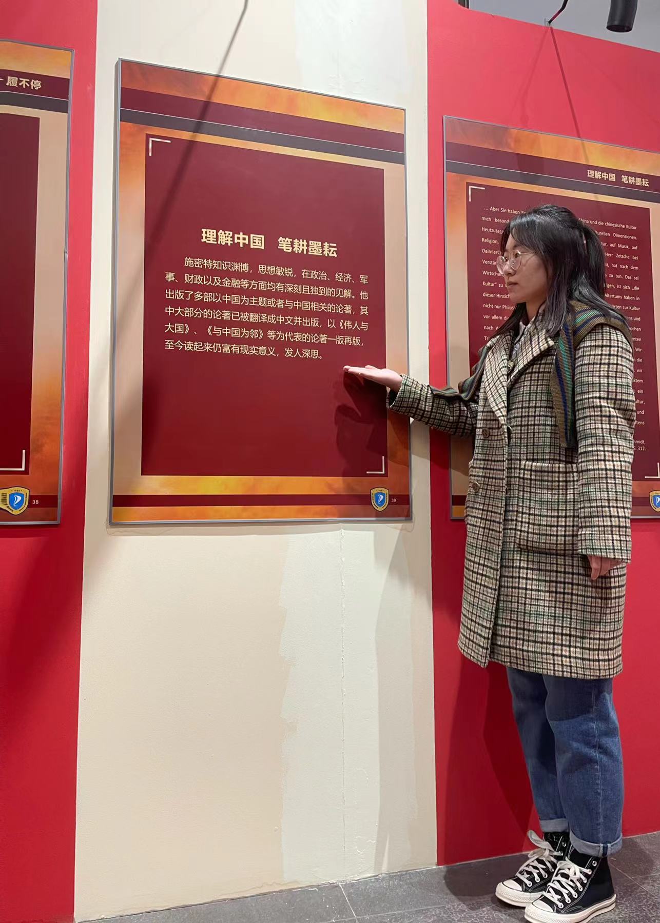 很荣幸能有此次机会担任中德展的讲解员,让我在加深自己对中德两国的了解的同时,把中德50年的友好关系讲给更多人听,同学长学姐们交流,向前辈们学习。在来访嘉宾的每一次驻足点头之间,我感觉自己口中的讲解词越来越有份量,也深深敬畏着中德友好关系的建设者、推动者,励志接好“桥梁建设者”这一棒,推动新时代中德关系行稳致远。