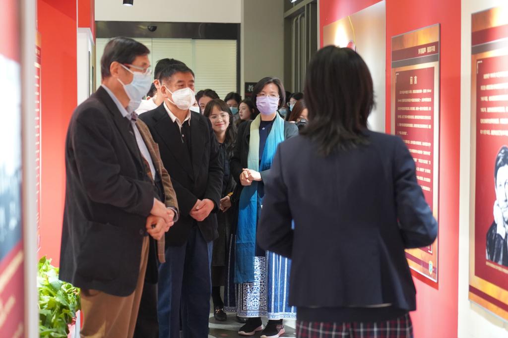 黄婉茹为北外必赢76net线路官网1977级校友荣裕民先生一行讲解