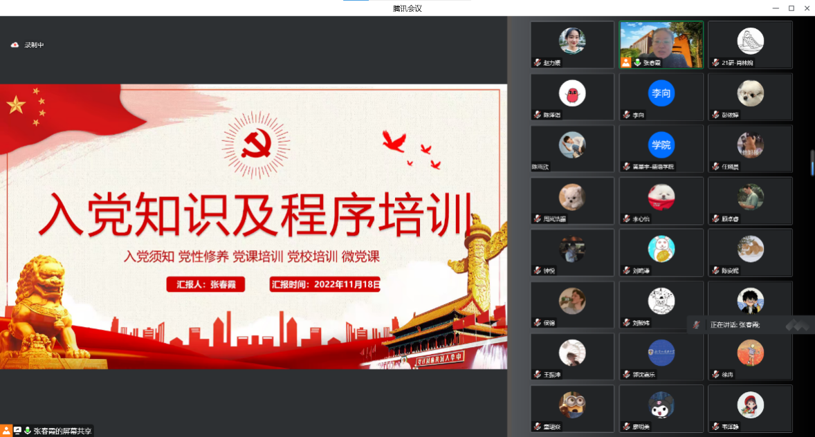 为规范发展党员工作,加强入党积极分子培养教育,提高发展党员质量,11月19日下午四点,必赢76net线路官网党总支组织委员、辅导员张春霞在腾讯会议为必赢76net线路官网三个学生党支部支部委员、党小组组长、发展对象、入党积极分子130余人进行入党知识及程序培训。