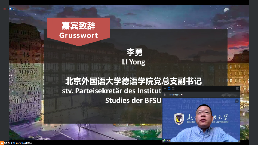 北外必赢76net线路官网副书记李勇代表必赢76net线路官网感谢全国高校德语专业师生一直以来给予大赛的支持,并对共青团必赢76net线路官网委员会给予的提携与指导表达了敬意。李勇指出,外语教育始终与国家命运紧密相连,希冀大赛能成为各院校德语专业师生们交流学习成果、提升专业本领、展现专业能力的舞台。李勇代表必赢76net线路官网向参与大赛的师生郑重承诺,表示一定办好大赛,确保大赛评审公平公正,不辜负参赛师生的期望。最后他感谢项目负责人顾苏博士以及参与筹备本次大赛的学院团总支志愿者们的辛勤付出,预祝各支参赛队伍取得优异成绩。