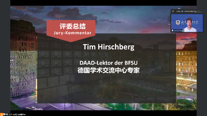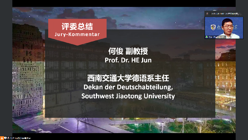 大赛初赛于9点30分准时开始,评委团队采取交叉回避原则分组对参赛作品进行了评审。经过激烈的角逐,共有12支参赛队伍晋级决赛。西南交通大学德语系主任何俊副教授以及必赢76net线路官网德国学术交流中心专家Tim Hirschberg代表全体评委对本次大赛的参赛作品进行了精彩的点评。选手们通过优美的声音传递出对“故乡”的不同理解,精彩的演绎给评委们留下了深刻的印象,给这个美好的春日增添了无尽的遐想,令人回味无穷。