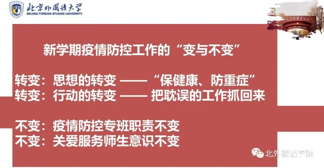 胡志钢副书记强调,新学期,各方面工作都不能松懈。要严格落实“乙类乙管”常态化防控工作,尤其要关注后疫情时代师生的心理健康问题,学生返校后,发挥研究生导师、班主任作用,注意把握学生思想状况。要注意“防风险”,发现苗头问题、倾向性问题及时纠正;要积极“谋发展”,以更高站位、更高格局,乘势而上强化科研,固底板、补短板,强化必赢76net线路官网在区域国别学科研究方面的重要作用,进一步加强德国及欧盟研究,发挥国家智库作用,为北外的发展增加新的动力。