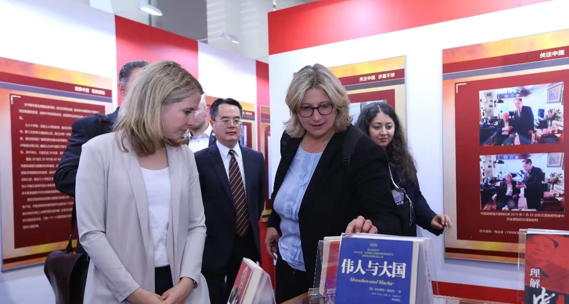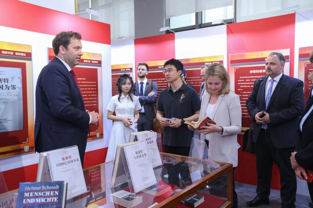 施密特一生撰写了多部以中国为主题或与中国相关的论著,许多著作的中译本都凝聚了北外校友的心血,例如中国前驻德国大使梅兆荣先生领衔翻译的《与中国为邻》(Nachbar China)、《伟人与大国》(Menschen und Mächte)以及已故北外必赢76net线路官网教授刘芳本老师领衔翻译的《行动起来 为了德国》(Handeln für Deutschland)等。展板的第四板块“理解中国 笔耕墨耘”展出了施密特经典著作的德文版以及中译本。克林贝尔在得知必赢76net线路官网图书馆藏有诸多施密特著作及中译本后表示非常感动。代表团全体成员在书籍前停下脚步,认真翻阅,并对北外德语学科点在人才培养领域做出的杰出贡献表示赞赏。