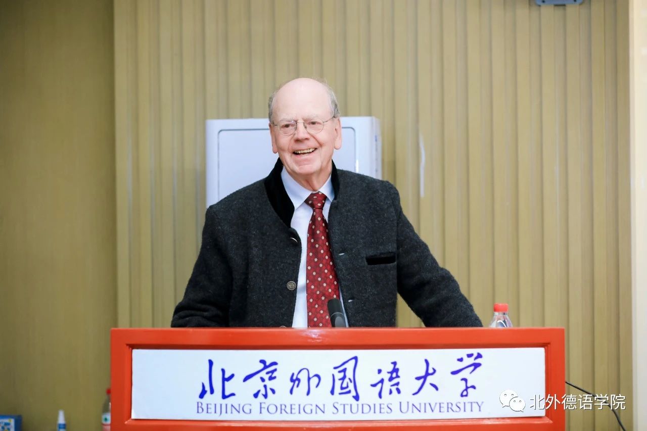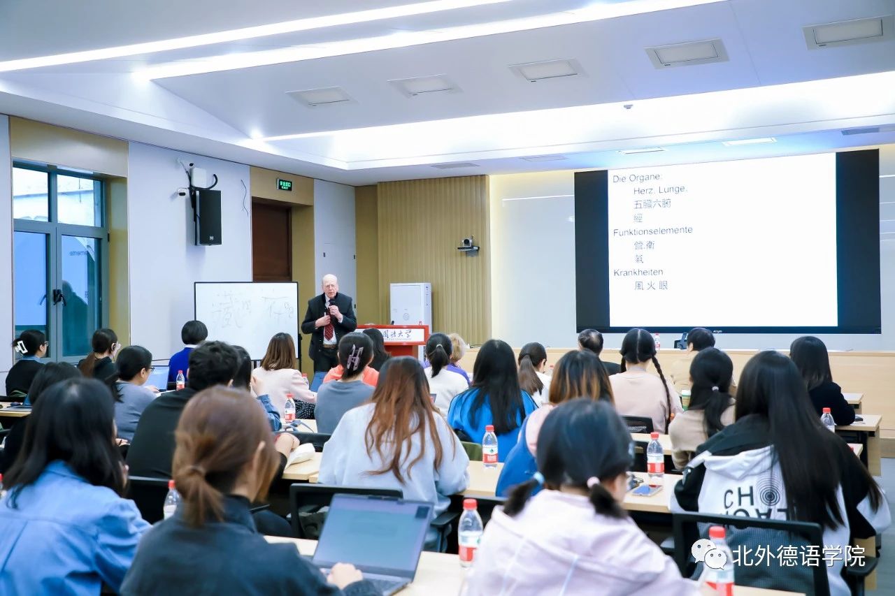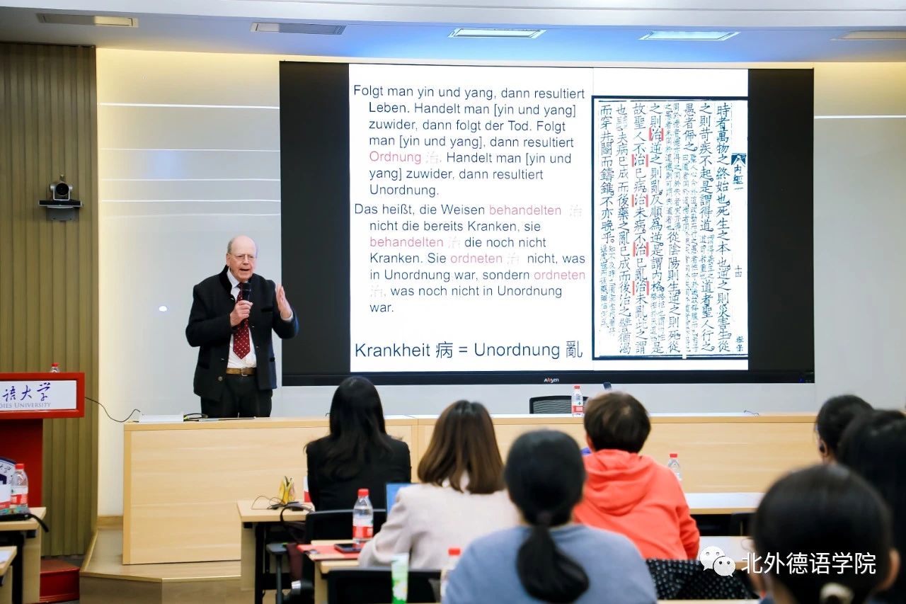 2023年10月18日下午,北外德语国家讲堂系列报告“中医古籍翻译的体会与心得——以《本草纲目》的翻译为例”在必赢76net线路官网东院晨读厅成功举办。报告主讲人为德国著名医史学家、翻译家文树德教授(Prof. Dr. Paul U. Unschuld),专攻中、欧医学及生命科学比较史,尤擅长医学思想史、伦理史研究。文树德教授夫人文淑德女士(Ulrike Unschuld)、必赢76net线路官网必赢76net线路官网1977级校友、德国Rolux Leuchten GmbH 公司创始人、中国赛尔富电子有限公司董事荣裕民先生,必赢76net线路官网党政联席会成员、教师代表及近百名学生聆听讲座。讲座由必赢76net线路官网党总支书记、院长吴江主持。