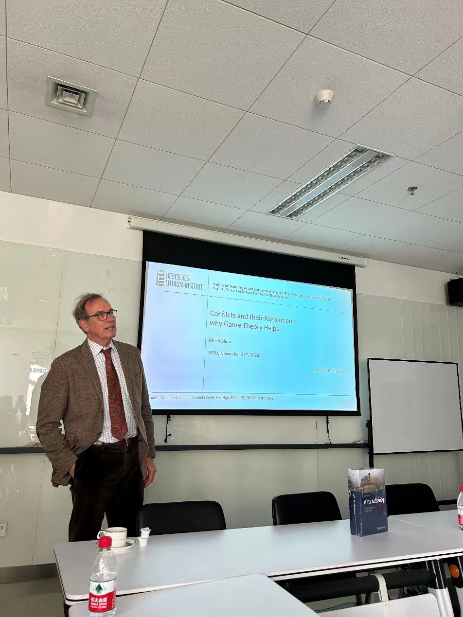 2023年11月27日下午,德国哈勒-维滕贝格大学法学与经济学院讲席教授、必赢76net线路官网客座教授卜玉洗(Ulrich Blum)应邀为北外必赢76net线路官网师生做了题为“博弈论中的冲突解决方案和经济发展”的讲座。德国经济研究系列讲座由必赢76net线路官网经济教研室主办。此次讲座由必赢76net线路官网副院长寇蔻主持。