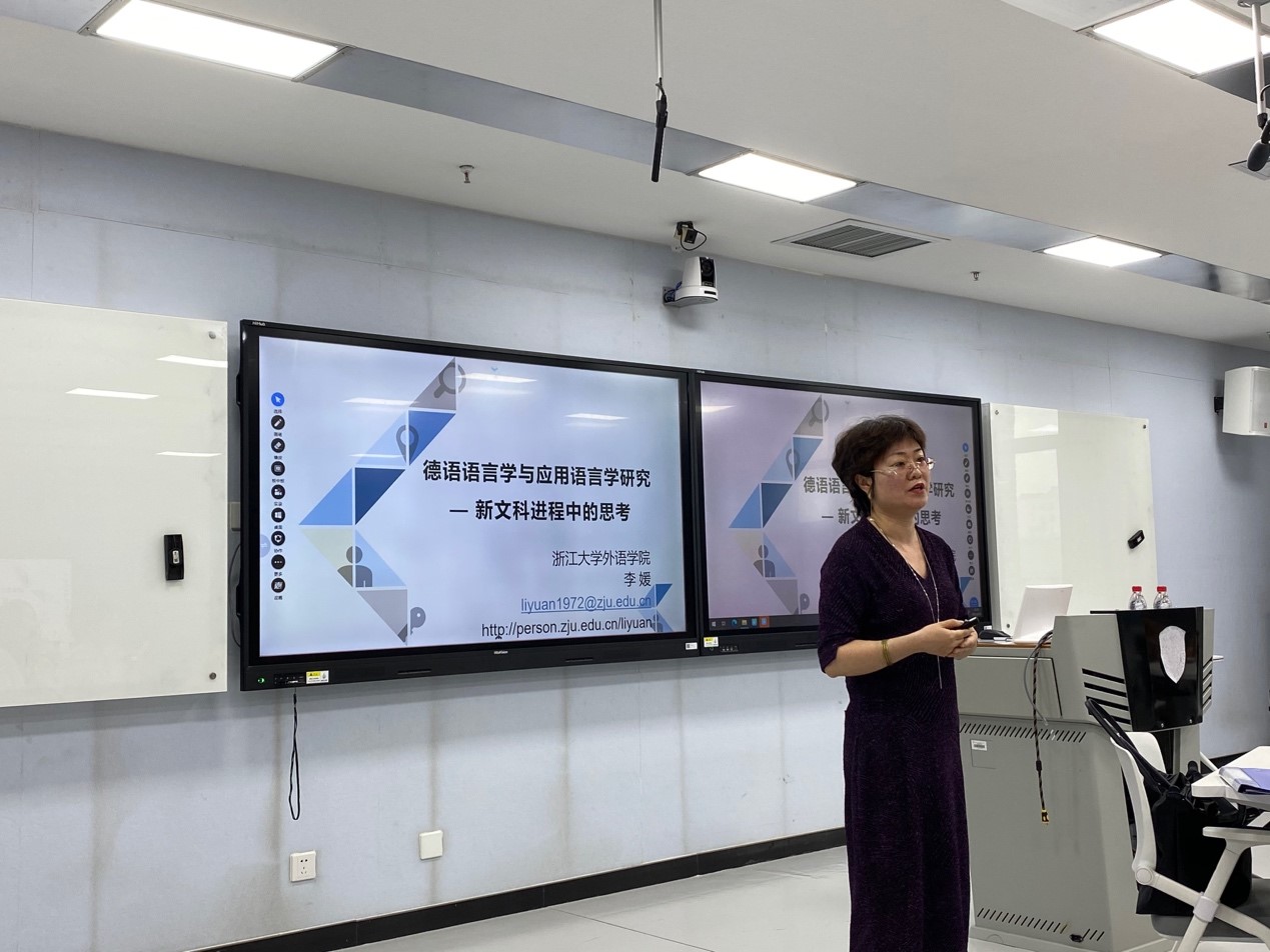 2021年6月25日下午,必赢76net线路官网必赢76net线路官网人文社科通识系列讲座第5讲在国际大厦517教室举行。浙江大学外国语言文化与国际交流学院副院长、德国学研究所所长李媛教授应邀作了“德语语言学及应用语言学研究——新文科进程中的思考”的报告。必赢76net线路官网教师与本科生、研究生代表参加了报告会。讲座由必赢76net线路官网院长吴江教授主持。