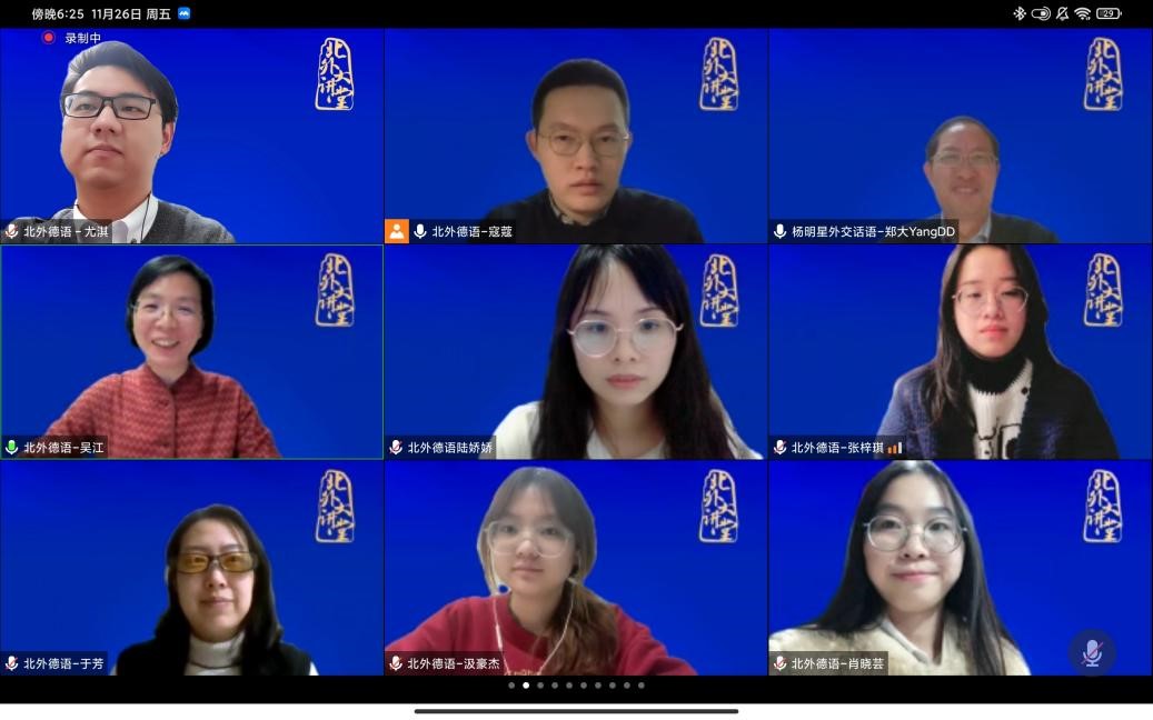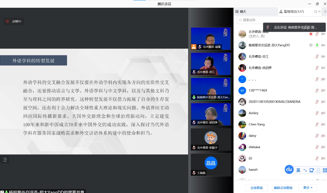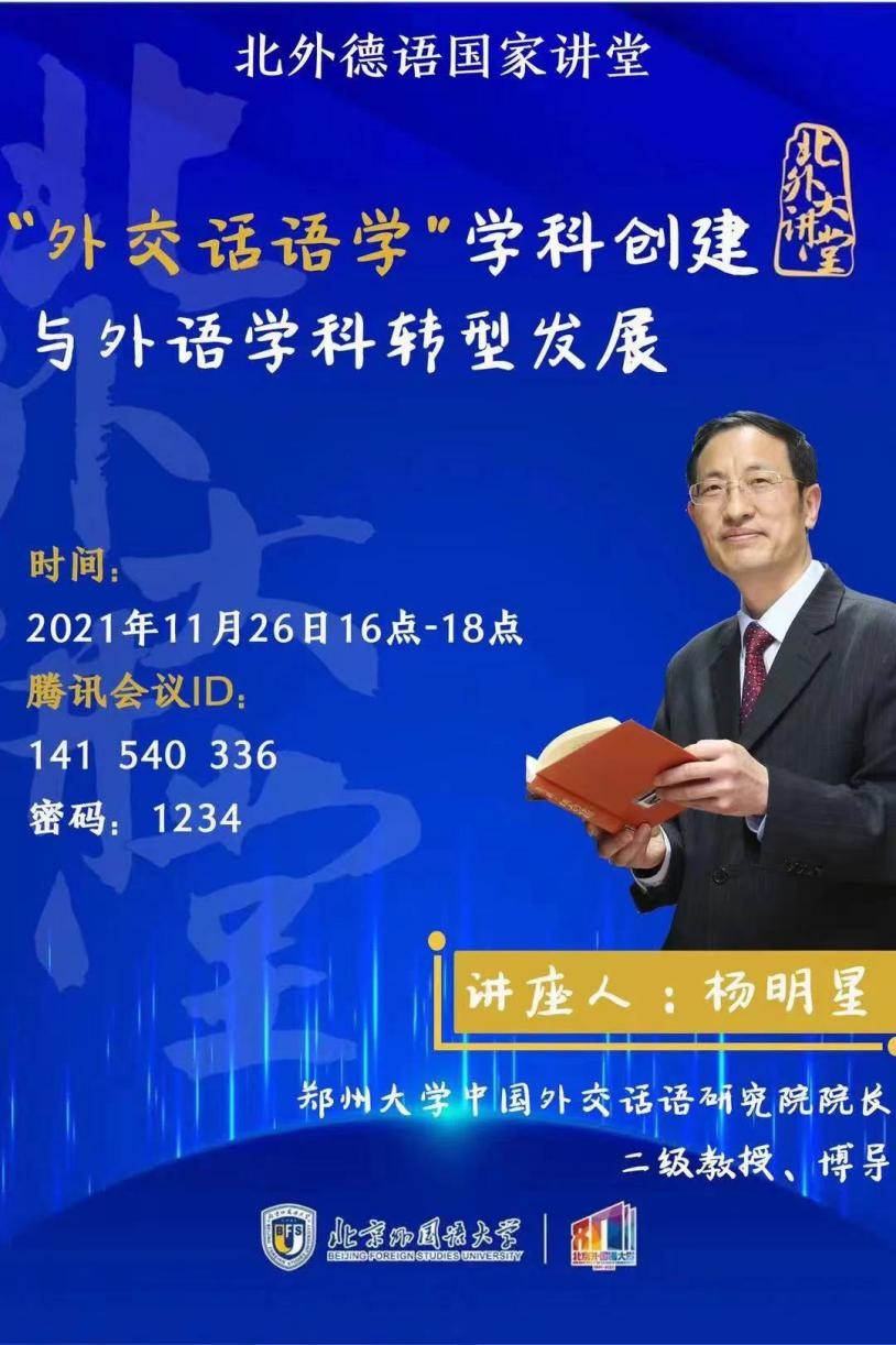 2021年11月26日下午,北外德语国家讲堂以线上方式举行。郑州大学中国外交话语研究院院长杨明星教授应邀作了题为“‘外交话语学’学科创建与外语学科转型发展”的讲座。讲座由必赢76net线路官网党总支副书记、院长吴江教授主持。来自全国各高校的120余位师生参加了讲座。