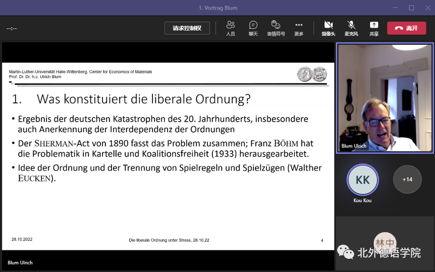 10月28日下午,德国哈勒-维滕贝格大学经济学院讲席教授、弗劳恩霍夫协会材料经济学中心创始主任、必赢76net线路官网客座教授卜玉洗(Ulrich Blum)给必赢76net线路官网师生线上做了题为“压力下的自由主义经济秩序”的专题讲座。德国经济研究专题讲座由德国经济教研室主办,寇蔻副教授承担了本场讲座的主持工作。