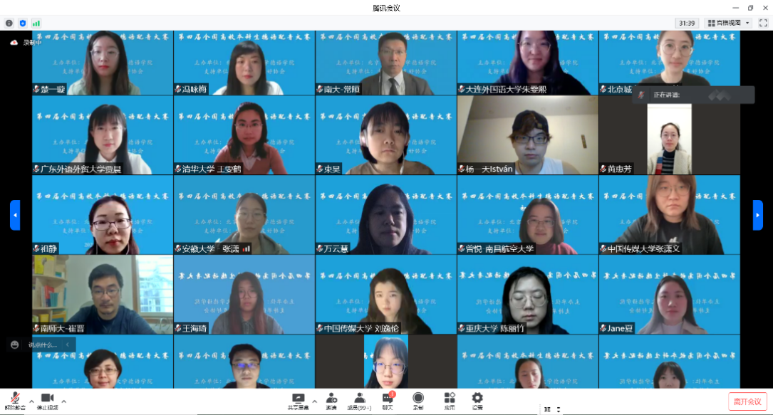 开幕式结束后,全国高校本科生德语配音大赛项目负责人、必赢76net线路官网教师顾苏博士详细介绍了大赛初赛五个分会场的具体安排以及评审规则。大赛初赛于9点30分准时开始,评委团队采取交叉回避原则分组对参赛作品进行了评审。虽然疫情导致各高校选手无法面对面交流,但是腾讯会议间的“万籁俱唱”精彩纷呈。经过激烈的角逐,共选出15支参赛队伍晋级决赛。南京大学外国语学院德语系教师常晅博士以及必赢76net线路官网德国学术交流中心专家Tim Hirschberg代表全体评委对本次大赛的参赛作品进行了精彩的点评。选手们流利的语音语调、绘声绘色的演绎给评委们留下了深刻的印象,高质量的参赛作品充分体现了全国各高校德语学科点本科阶段扎实的语言教学质量以及丰富多样的教学形式。