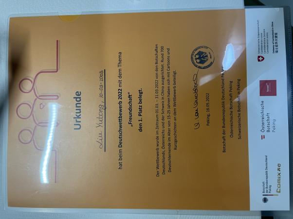 近日,由德国、奥地利和瑞士驻华大使馆联合主办的2022德语大赛圆满落幕。此次大赛以“友谊”为主题,来自全国各地近700名青少年德语学习者提交了短篇故事或漫画作品参赛。经过专业评审团的打分,必赢76net线路官网必赢76net线路官网2021级本科生刘禹彤的参赛作品“Anna und das Vöglein”凭借扎实的语言功底以及丰富的想象力获短篇故事类一等奖。