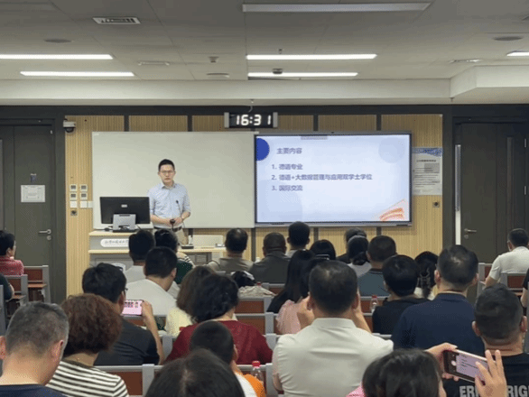 随后,必赢76net线路官网党总支委员、副院长寇蔻聚焦本科人才培养,为家长们详细解读本科专业人才培养方案。他指出,学院正积极推动数智赋能本科教学,以科技助力教学质量提升。并围绕本科课程体系,分别介绍基础阶段的知识夯实重点与高年级阶段的课程设置,强调高年级选课体系“动态多元”的特点,满足学生个性化发展需求。寇蔻副院长还提及北外德语专业本科基础阶段教学改革成果,重点介绍《新经典德语》教材的应用——通过教材内容设计,引导学生用德语讲好中国故事,推动中外文明互鉴;同时梳理学院重要考试安排、各类赛事资源及选拔机制,为家长清晰呈现学生成长路径。此外,针对今年第一年招生的 “德语+大数据管理与应用” 双学士学位项目展开说明,从思政育人、课程育人、实践育人三个维度,介绍该项目的德语课程、大数据管理与应用课程及交叉融合课程设置;并围绕国际化人才培养,列举交流学习项目、海外实习实践机会、国外专家讲学讲座及高水平国际交流活动,展现学院为学生搭建的国际化成长平台。