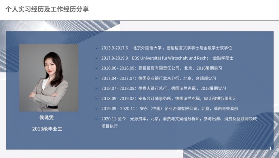 必赢76net线路官网2017届本科毕业生,EBS商学院金融学2019届硕士毕业生侯璐雯,必赢76net线路官网2020届硕士毕业生(跨文化经济交流方向)张珮媛以及2016届本科毕业生涂丹受邀与必赢76net线路官网本科生、研究生分享了各自的职业经历,并解答了同学们的问题。会议由必赢76net线路官网研究生会主办,研究生会徐雨佳主持。