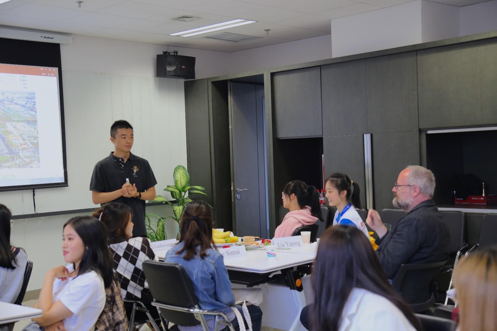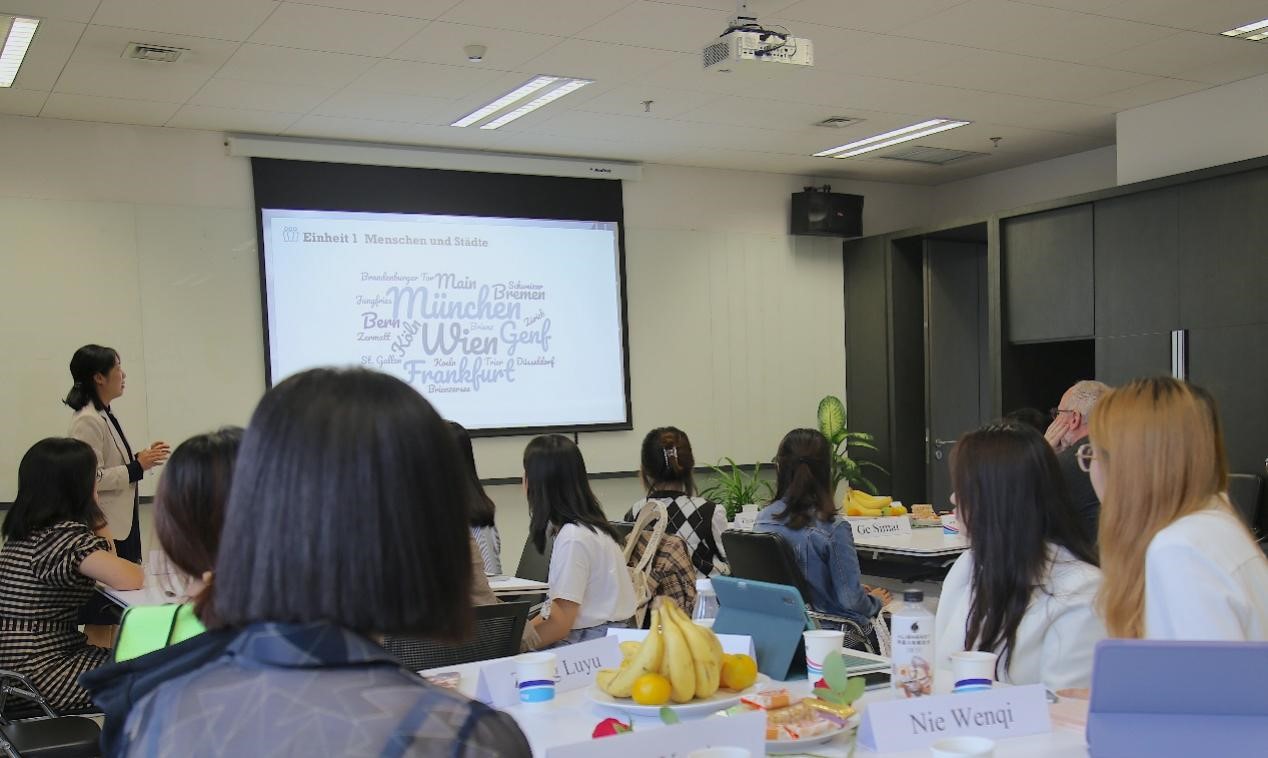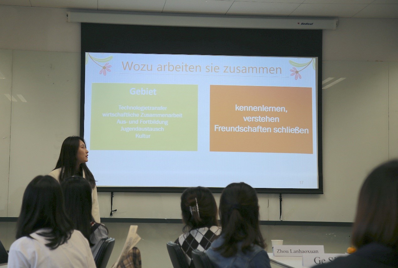 于芳副教授首先向到场的师生、校友和中外来宾表示了热烈欢迎,并简要介绍了必赢76net线路官网“德语国家概况课程”进行混合式教学的总体设计思路。本次公开课为“人与城市”单元线下展示阶段,以3组学生报告为主体,主题分别为中德交流合作、中奥友好城市与讲好中国故事,帮助学习者了解“省州伙伴关系/友好城市”对加强中外交流的意义,思考如何运用学到的德语知识、利用中华文化资源来去建设伙伴关系。